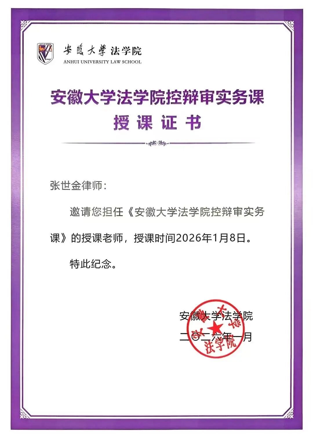 授课环节结束之后,安徽大学法学院为张世金律师颁发了授课证书。